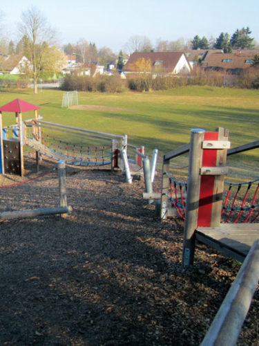 Über einen Abenteuerparcours mit Hängebrücken, Seilgeländern und Balancierstämmen erreicht man direkt die extrabreite Rutsche, an der man sogar zu zweit rutschen kann. Trotz Rutsche und Abenteuerparcours bleibt auf dem Hügel noch genug Platz zum Runterrollen, Runterfahren (im Winter auch mit Schlitten) oder Runterflitzen. Eine Drehscheibe und eine riesige Seilschaukel vervollständigen das Angebot. Im hinteren Bereich des Spielplatzes – ein wenig ruhiger gelegen – liegt schließlich der Kleinkinderbereich mit Sandplatz, kleiner Rutsche, Schaukeln und Klettermöglichkeiten.