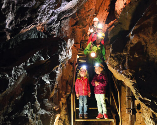 Verschiedene Themenhütten, eine Schauschmiede und das Freigelände mit Kohlemeiler, Hochofen und Spielplatz laden im kostenlos zugänglichen Museumsdorf zum Staunen ein. Ein besonderer Tipp ist der Andreas-Tagebau: Hier wurden einige Teile der alten Grubenanlage wieder freigelegt und erlauben einen tiefen Einblick in den Alltag der Knappen vor 300 Jahren. Für kleine und große Forscher:innen gibt es außerdem die aufregende Erzgruben-Rallye und eine interessante Lauschtour mit „Grubi“ dem Maulwurf und vielen Einblicken in die Geologie und Geschichte des Grünten. Das Highlight der Erzgruben Burgberg ist die Entdeckertour: Nach einer Wanderung durch die herrliche Natur folgen zwei Stollenzugänge von jeweils rund 25 m in die historischen Theresien- und Annagruben. Helm und Lampe voraus erleben Besucher:innen beim Einfahren die originalen Abbaubereiche, in denen noch heute die Handarbeit und der Mut der Knappen spürbar wird.